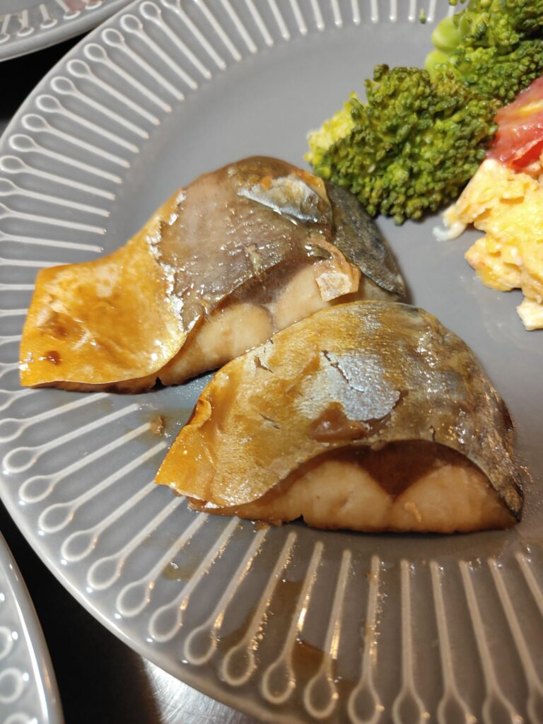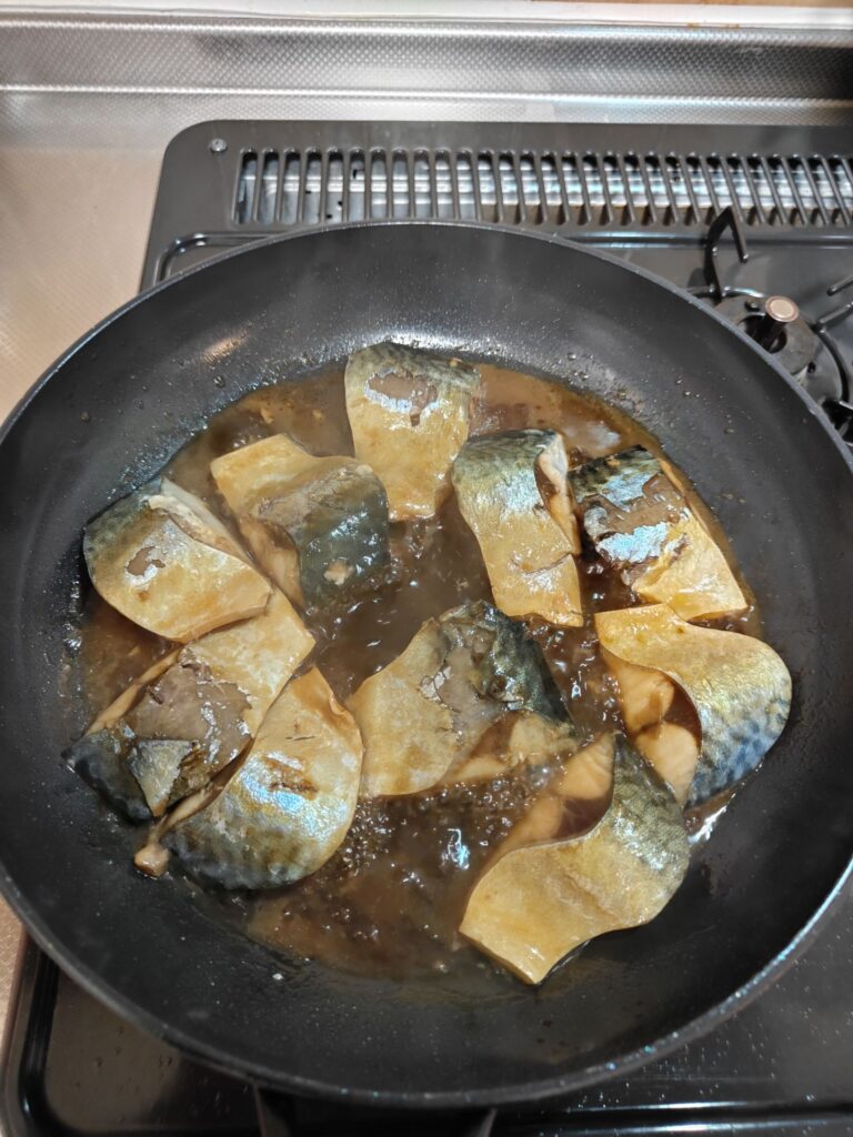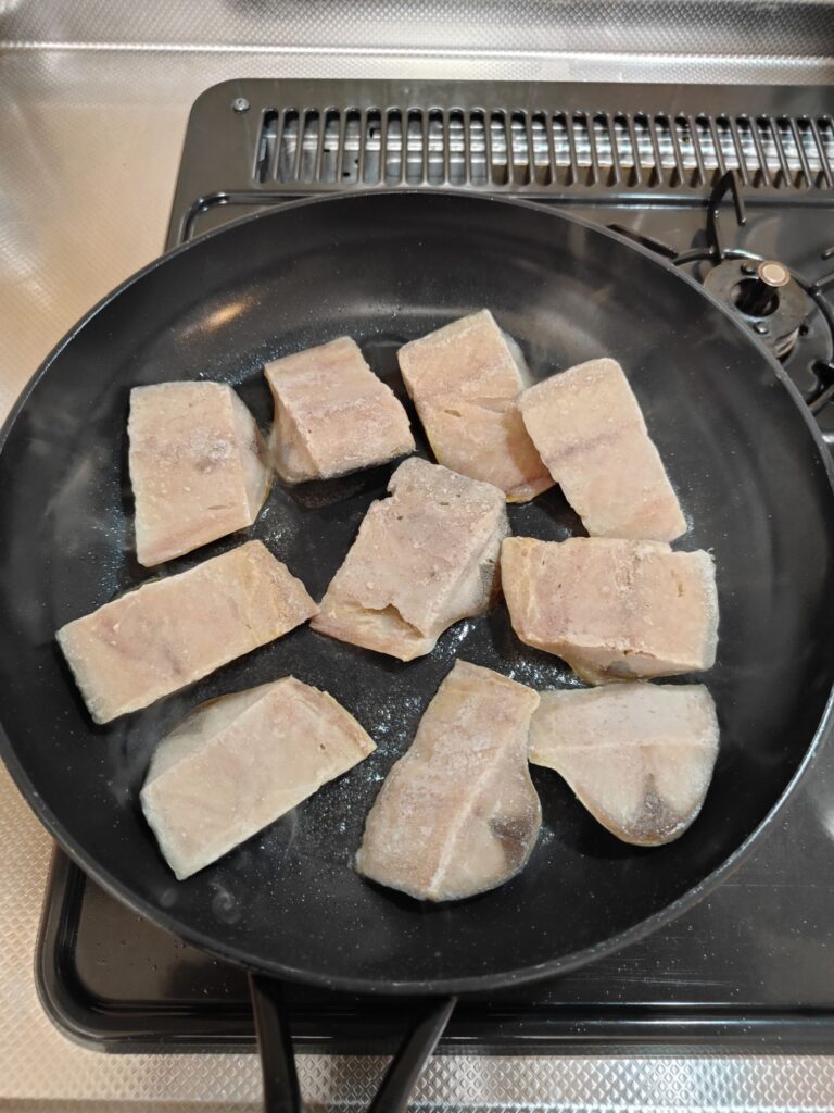 フライパンに凍ったままのさば切り身を並べ、蓋をして中火で焼きました。