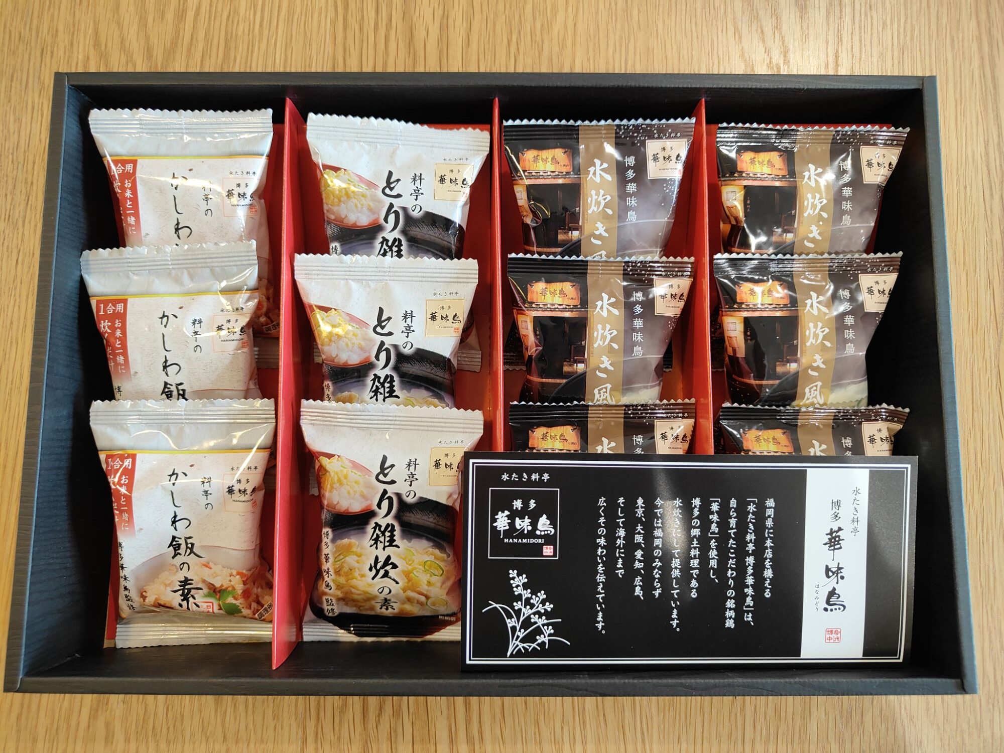 博多の名店「水たき料亭 博多華味鳥」監修のギフトで、かしわ飯の素、とり雑炊の素、水炊きスープがセットになっています。