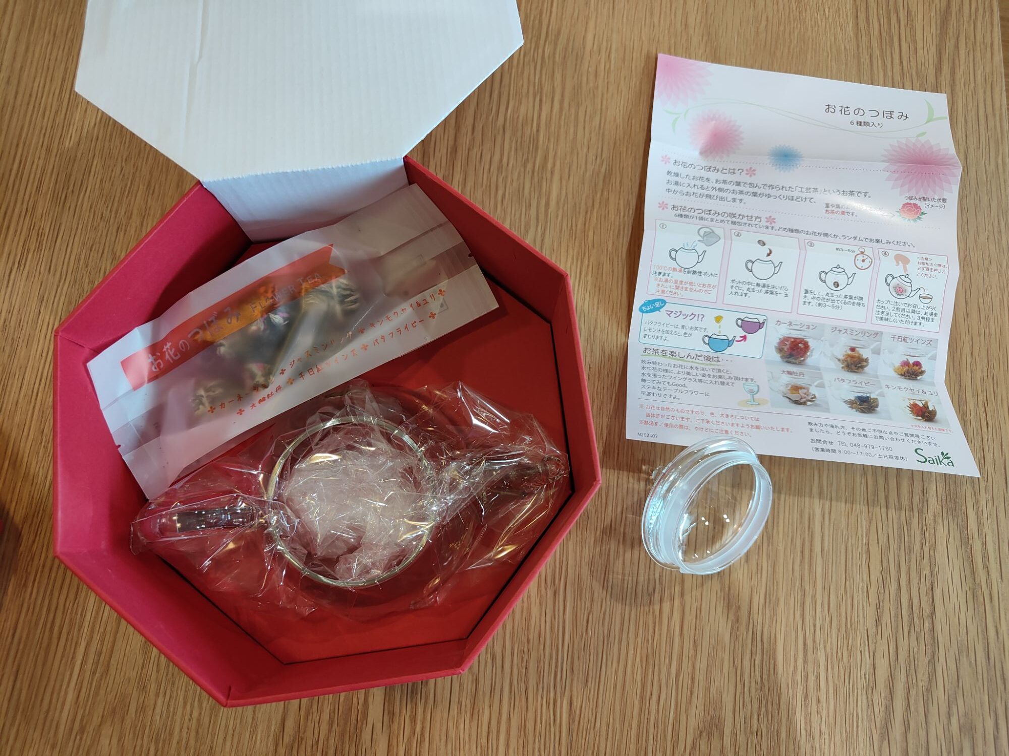 内容工芸茶6種類×各1個、ガラスティーポット1個、説明書1枚