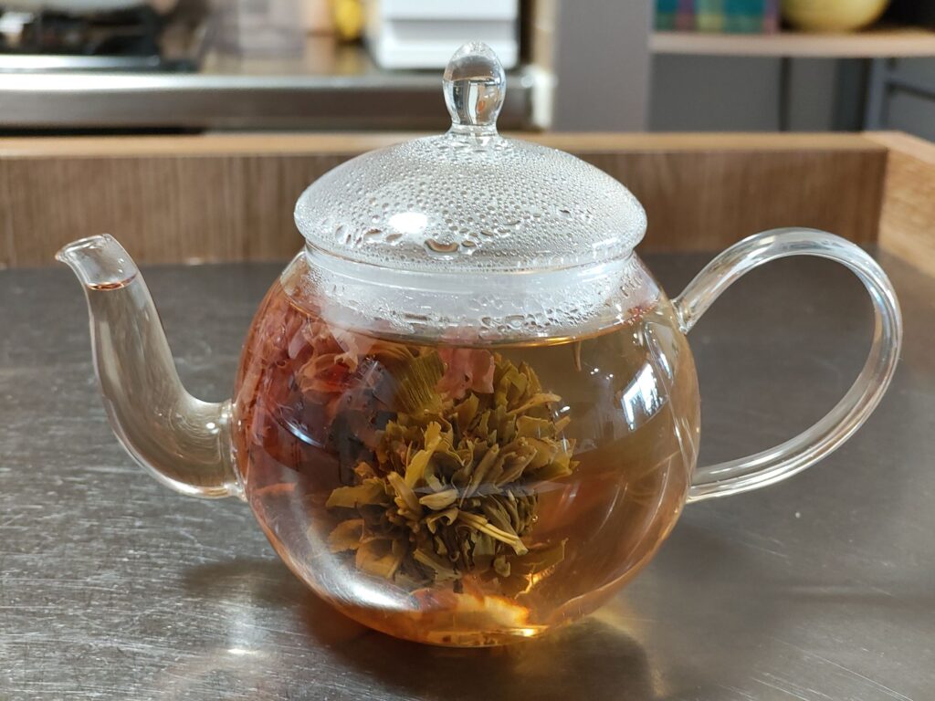 白茶をベースに、カーネーションやジャスミン、牡丹、千日紅などを使った工芸茶が6種類入っていて、さらにガラスのティーポット付き。