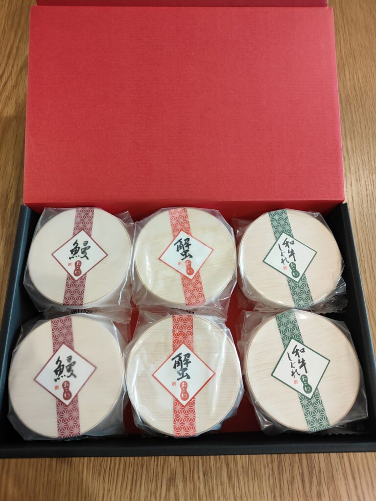 うなぎおこわ、かにおこわ、牛しぐれおこわの3種類が各2食ずつ入っていて、レンジ調理で食べやすい“ごちそう系ギフト”という印象です。