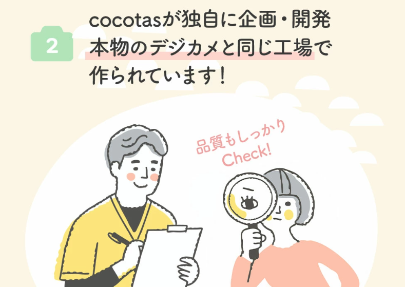 公式サイトには「ココタススタッフが製造工場といちから開発をスタート。玩具工場ではなくカメラ工場のラインで生産しています。」
