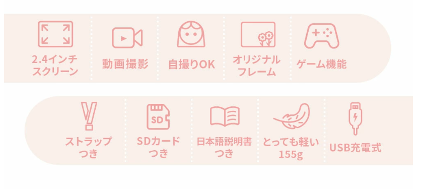 | 撮影機能 | インカメラ(自撮り) 効果フィルター(16種類)・フレーム(12種) タイマー撮影:オフ/2秒/5秒/10秒 日付表示:オン/オフ |
