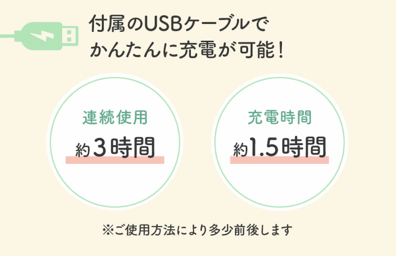 ただ、使用方法にもよりますが、連続使用約3時間、充電時間約1.5時間なのでそこまで頻繁に充電しなくても大丈夫ですよ。