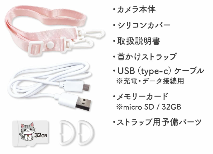 | セット内容 | ・カメラ本体(新ピントキッズカメラ) ・USB(type-c)ケーブル ※充電/データ接続用 ・メモリーカード(microSDタイプ/32GB) ・シリコンカバー(WITHyouデザイン/クローバーデザイン) ・首掛けストラップ ・取扱説明書 |